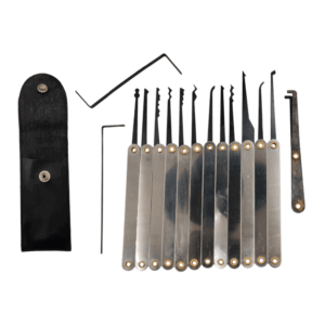 Juego de ganzúas de 15 piezas, ideal para cerrajeros profesionales y principiantes. Incluye diferentes modelos para apertura de cerraduras con precisión.